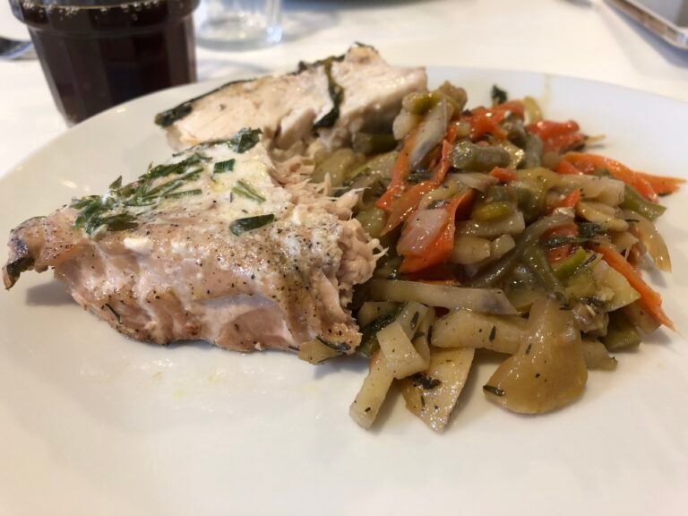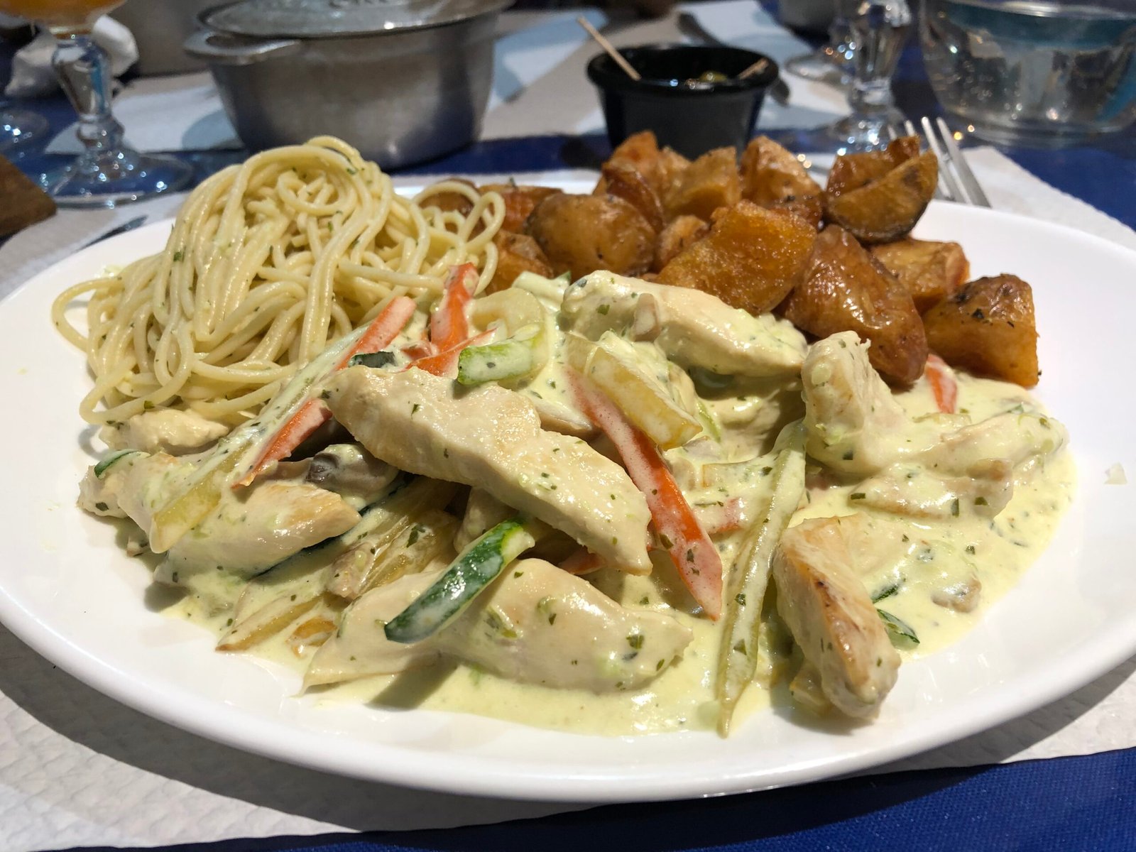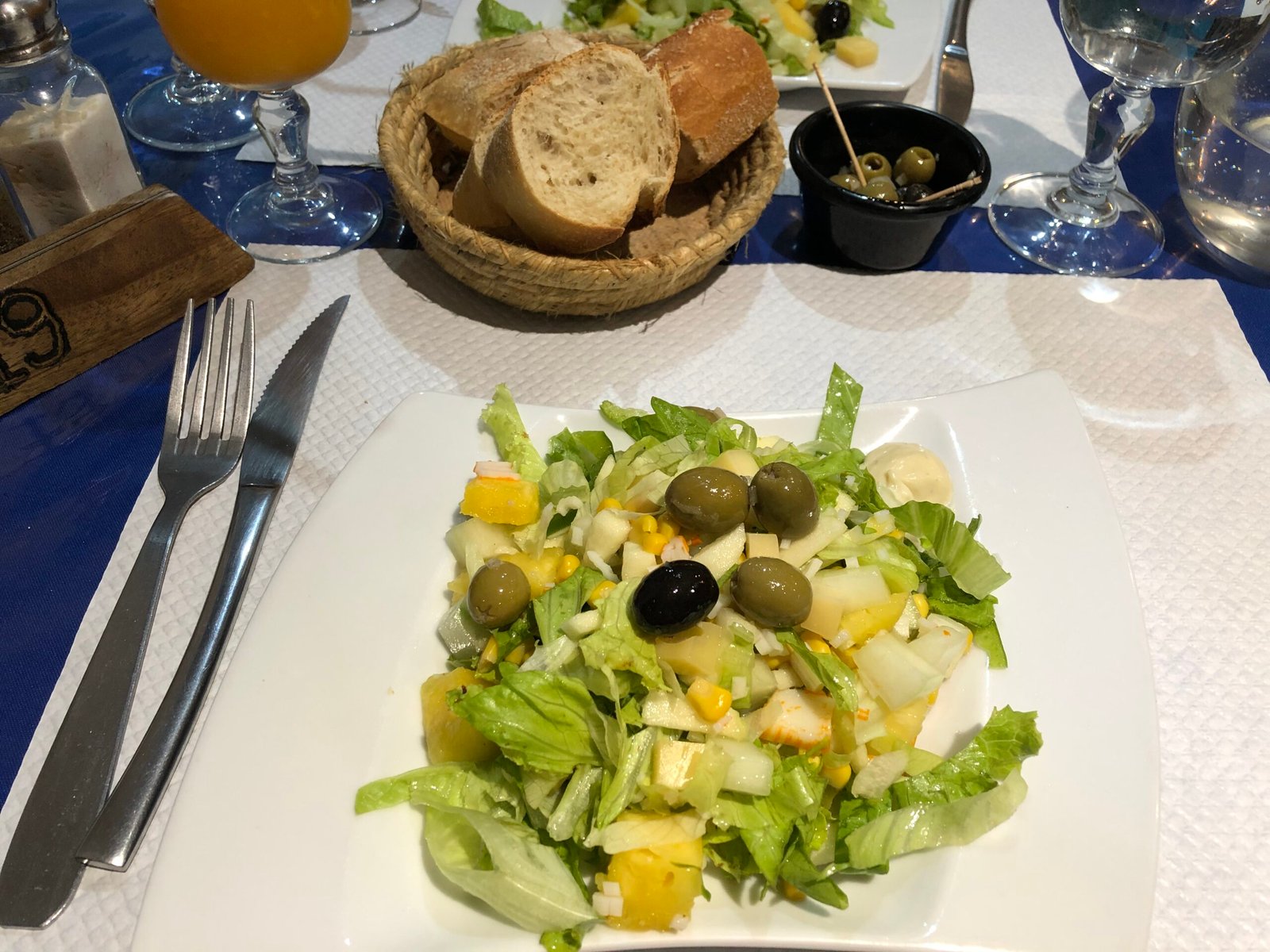 When we arrived at the restaurant, dinner was already planned as part of the travel package we had booked. There was no menu to browse or choices to make; everything was set. We started with a salad, which I enjoyed, fresh and light after the walk along the beach.